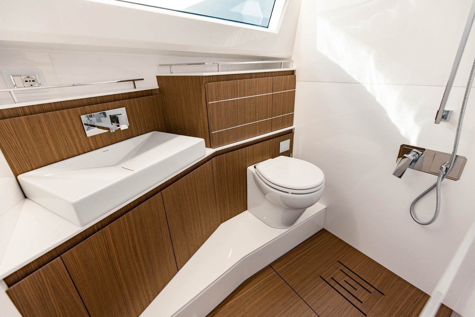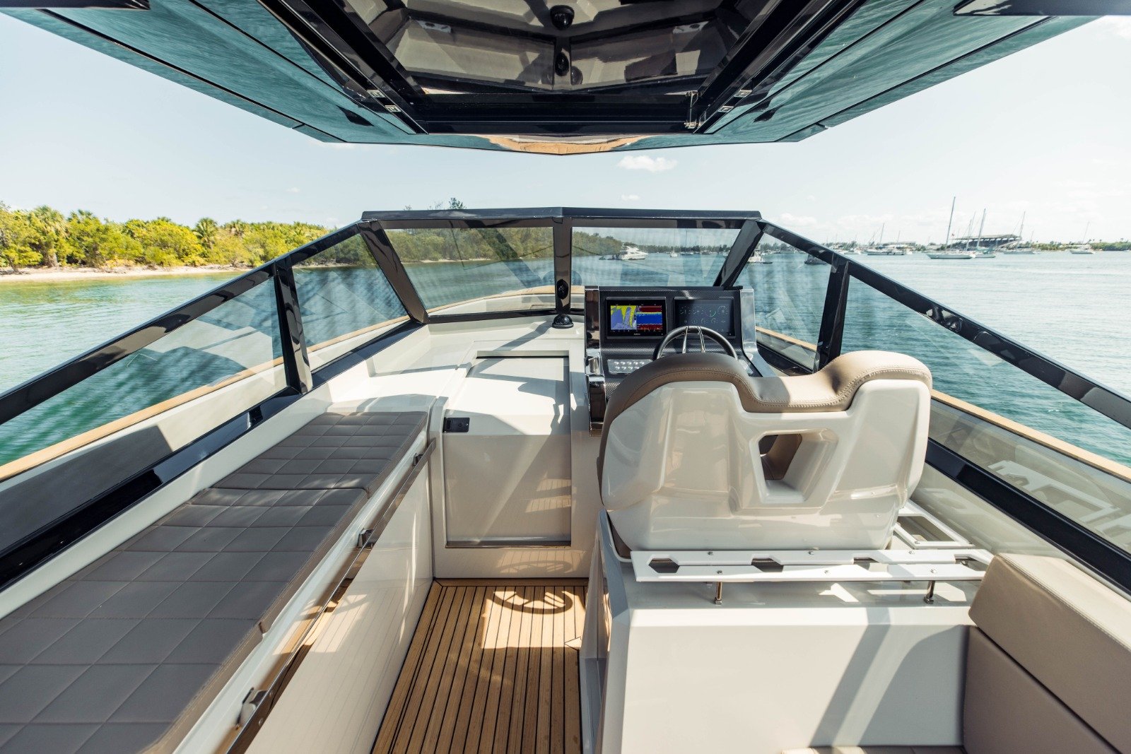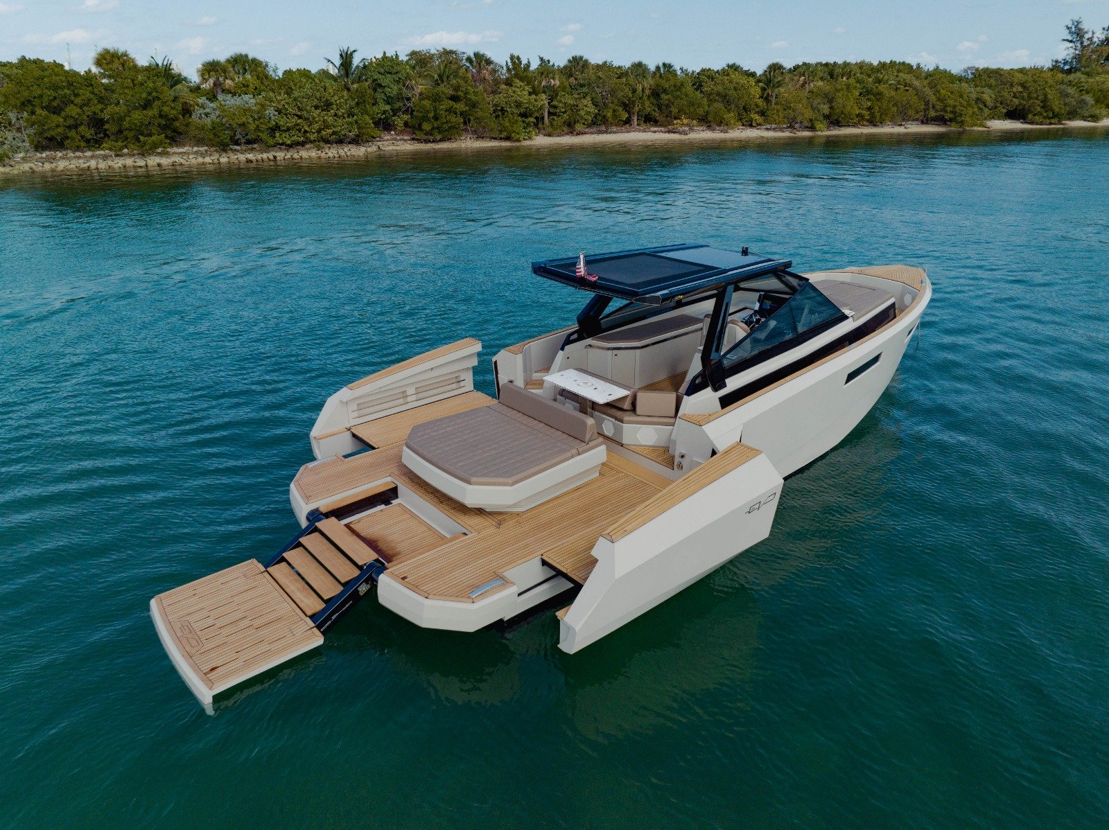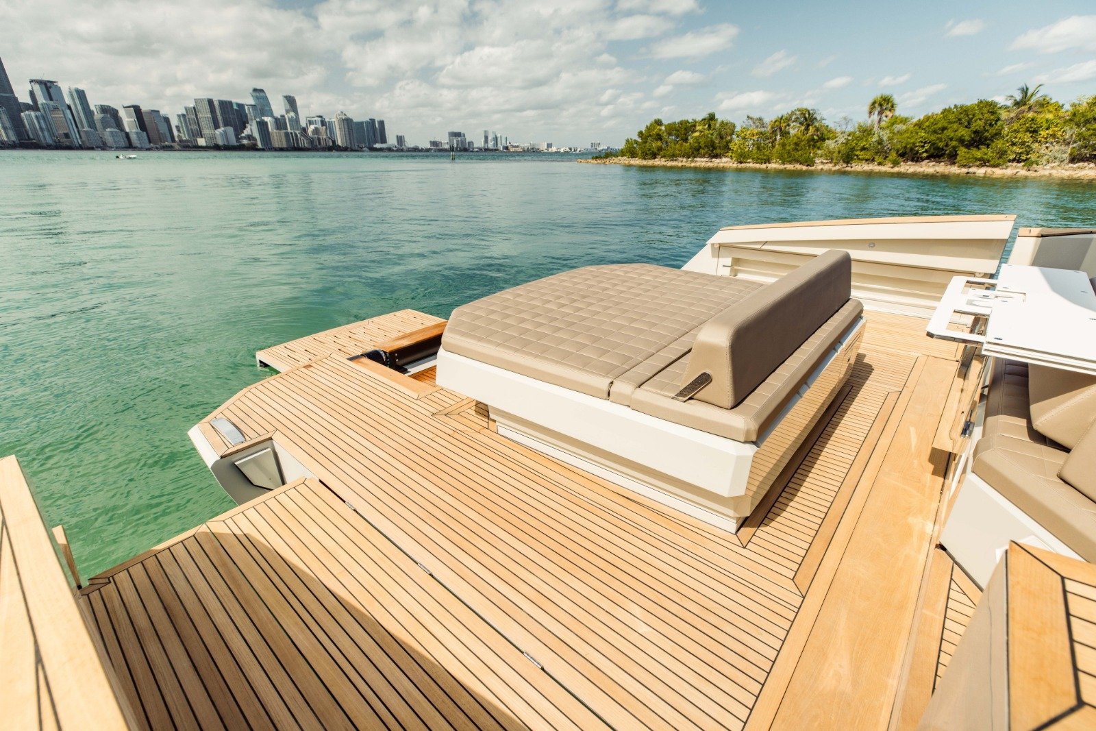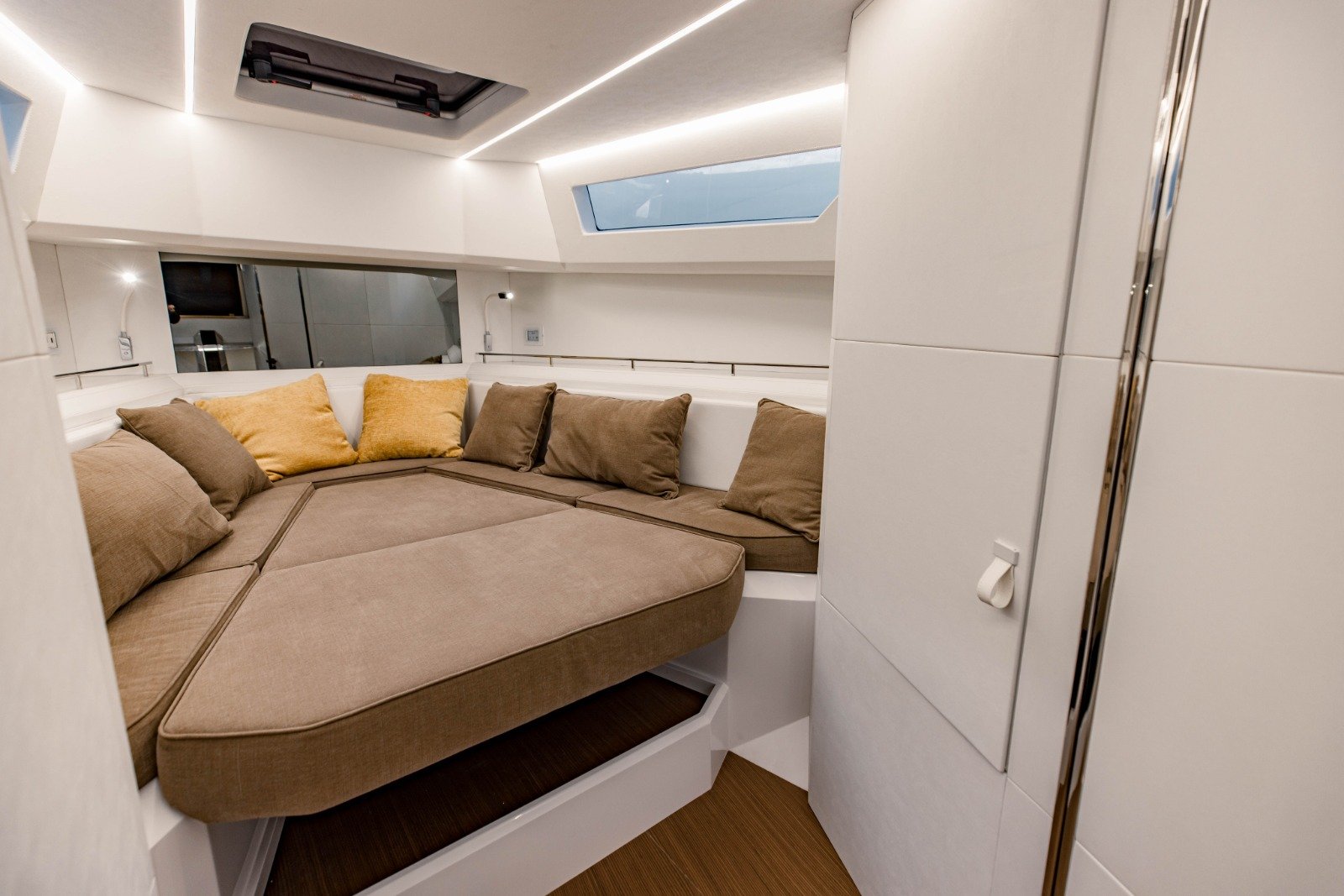 Its innovative design features a spacious bow sundeck, a large aft relaxation area, and signature side expandable platforms that increase the deck surface by over 40%, creating an expansive beach-club-style lounge perfect for sunbathing, dining, or dipping into the turquoise Mediterranean. Below deck, you’ll find a comfortable double cabin and well-equipped dinette for overnight stays if desired.