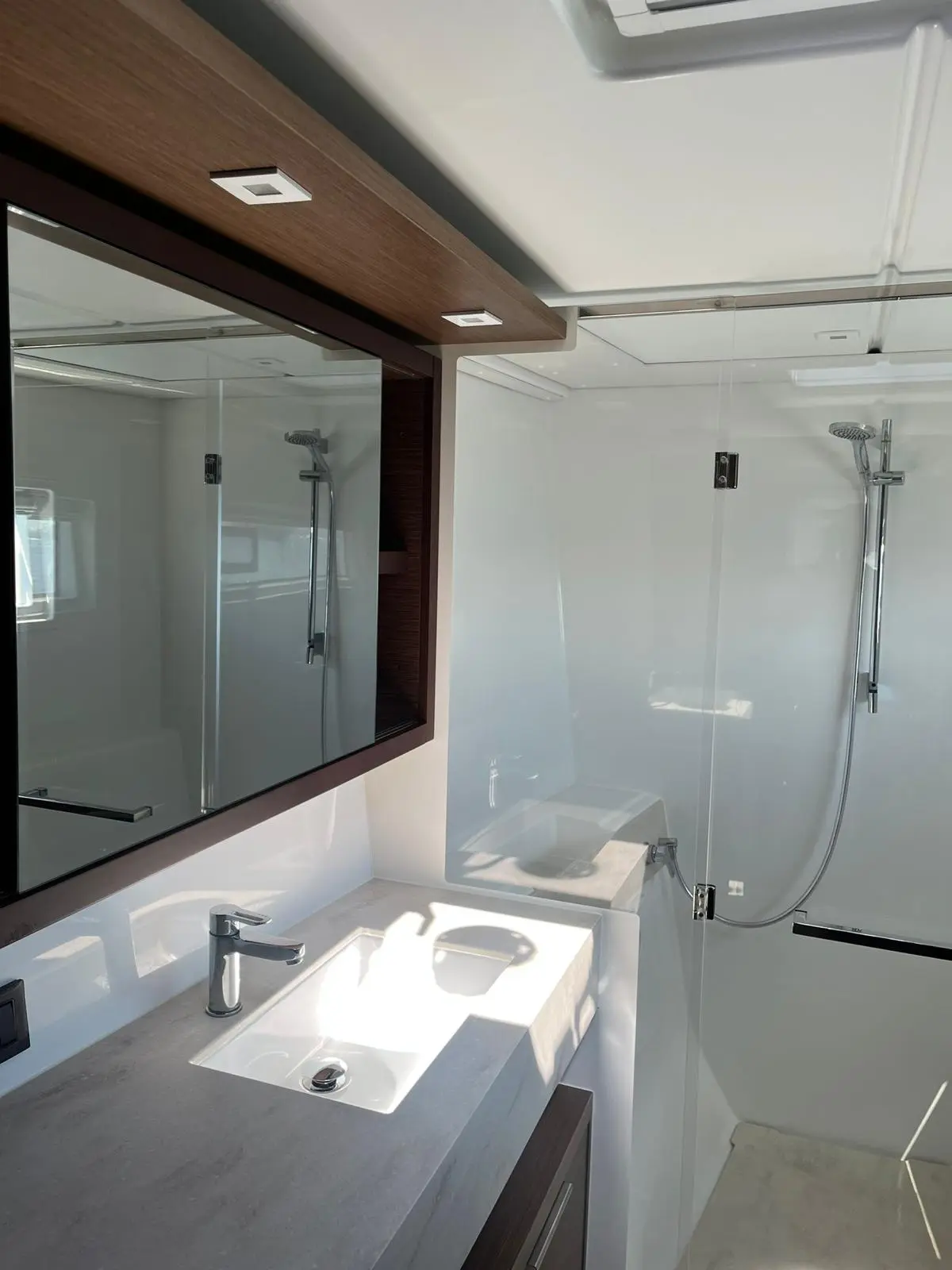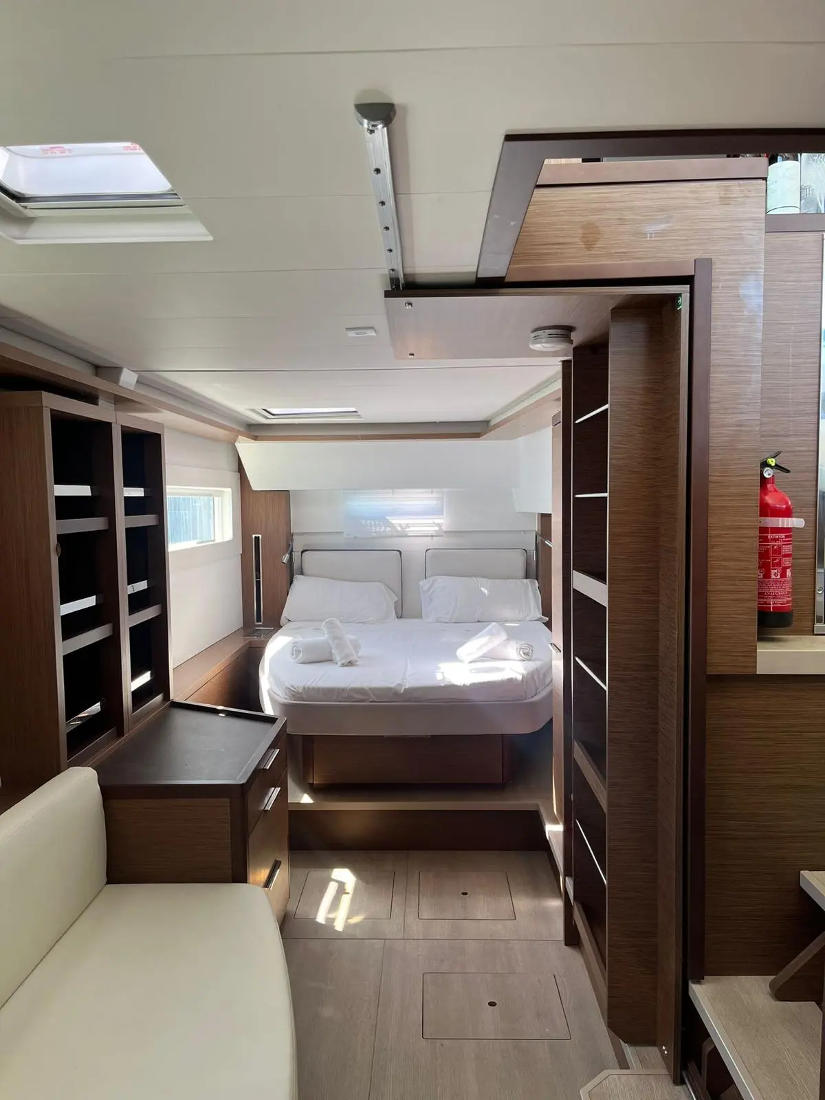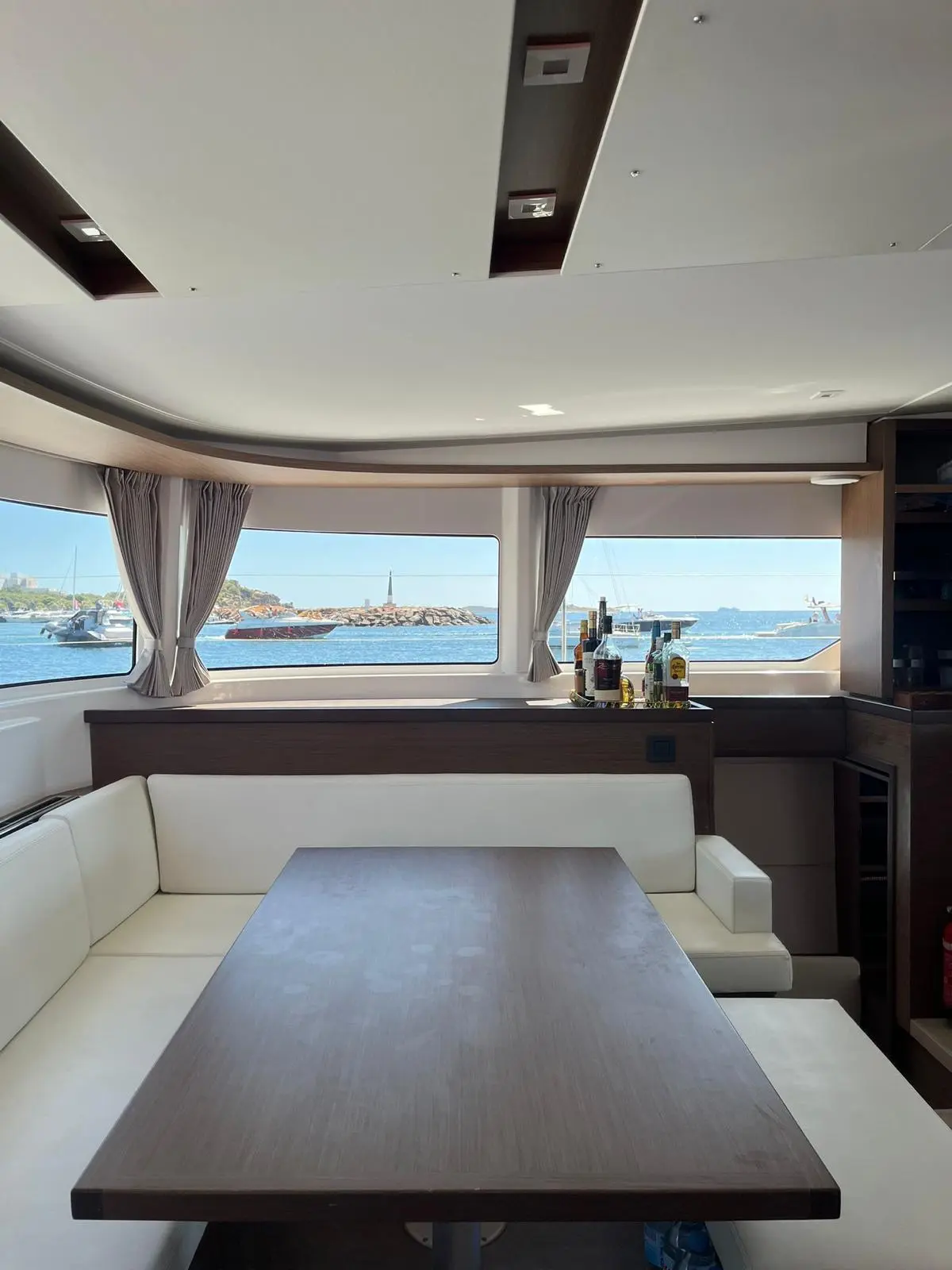 Thirteen is a very well equipped Lagoon 46. The impressive layout of this boat provides 3+1 cabins and same number of toilets with an amount of space that is out of the ordinary. You will find that on this boat both stern and bow cabins count with the same amount of space. This boat has the most space you could ever find on 46ft catamarans. The finishings on the interior are of utmost quality and the lighting was carefully thought for the guests’ comfort. The hydraulic bathing platform at the stern, the AC and watermaker are some of the features that make vacations on board of Thirteen unique.